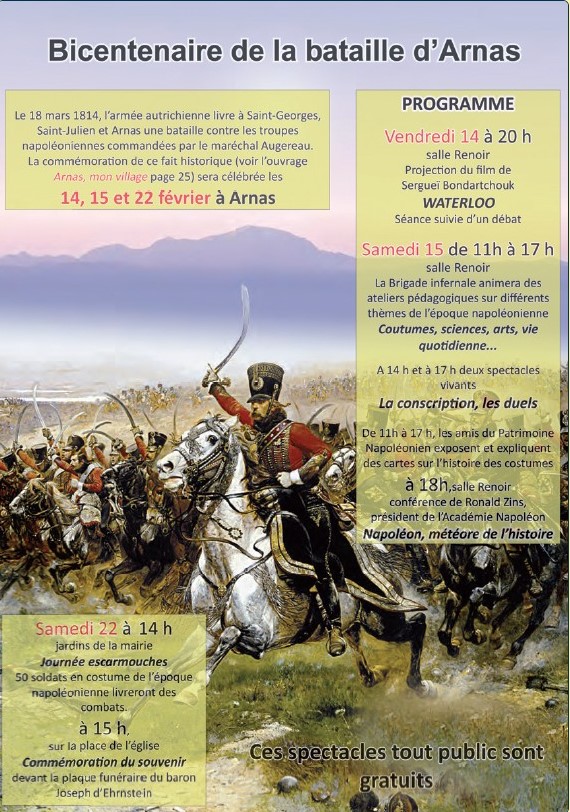 Commandée par le maréchal Augereau, l’armée de Lyon remporte quelques succès fin février 1814, l’arrivée de renforts autrichiens se dirigeant vers Mâcon contraint Augereau à revenir défendre lyon. À la mi-mars, en vallée de Saône, les Autrichiens sont en nombre très supérieur aux dix milliers de soldats d’Augereau. Le 17 mars 1814 les belligérants se positionnent en divers points stratégiques sur la rive droite de la Saône. Le 18 mars des combats furieux se déroulent autour de Marzé, de Saint-Georges et en particulier au lieu-dit de Marsangues. Augereau se voit contraint d’ordonner la retraite au cours de laquelle de féroces combats de cavalerie ont lieu vers Arnas. Les troupes françaises en infériorité numérique infligent des pertes sévères à l’ennemi, la retraite se déroule en bon ordre et au soir du 18 mars les Autrichiens sont aux portes de Lyon. La bataille se poursuit autour de Lyon où les Autrichiens entrent le 21 mars tandis que Paris tombe le 31 mars. La commémoration de ces combats a été célébrée à Arnas en février 2014.